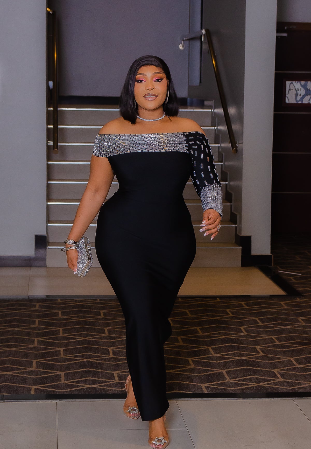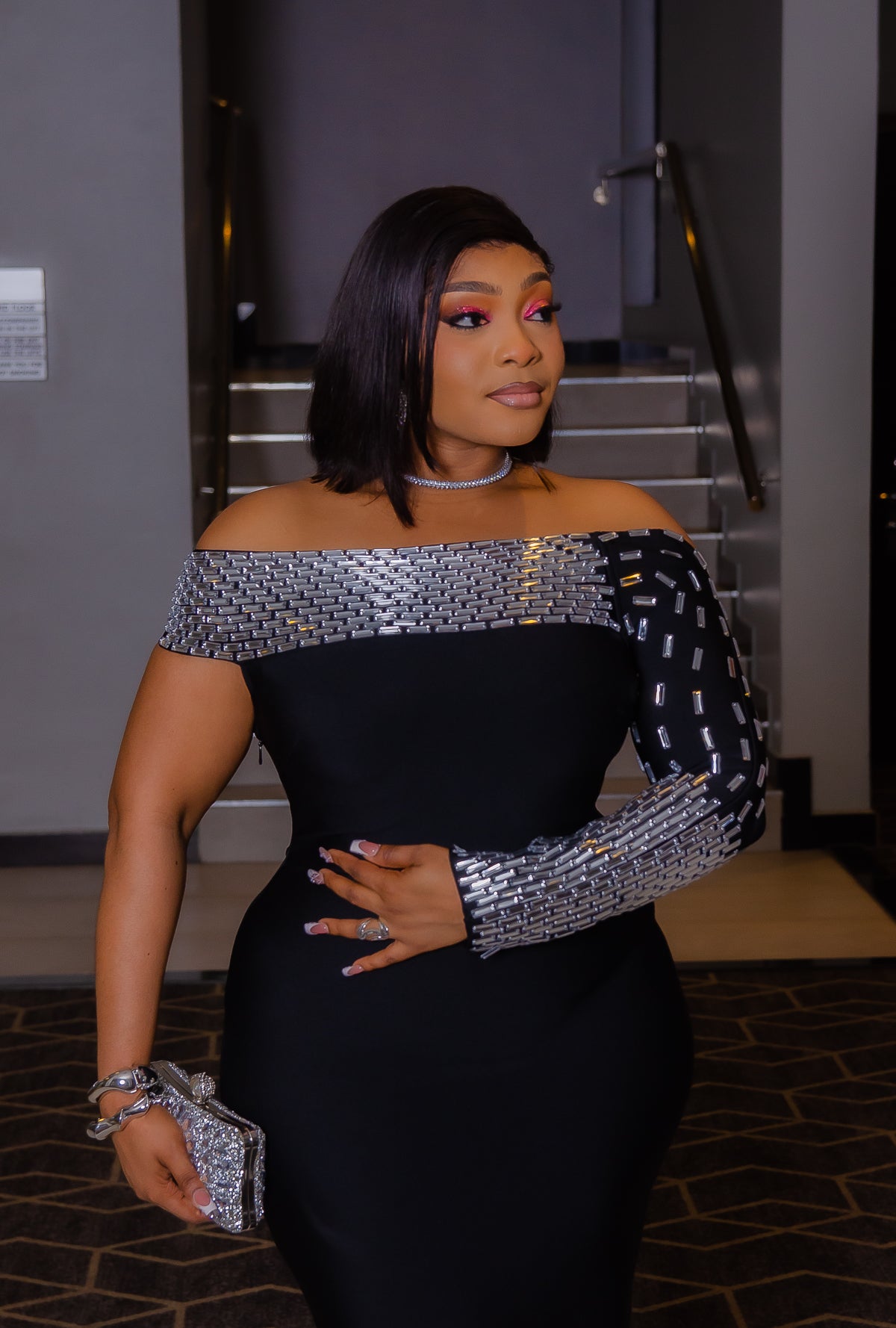 Unveil your royal side in the Majestic Mirage Dress , a luxurious black bandage gown designed for the woman who reigns with elegance. Featuring a one-sleeve asymmetric silhouette — one long sleeve and one short off-shoulder cap sleeve — this couture masterpiece is wrapped in exquisite 3D acrylic geometric gems that shimmer along the neckline, sleeve, and shoulder. Perfect for red-carpet events, gala nights, weddings, or luxury dinners, this timeless piece defines sophistication, power, and poise. This dress will ensure all eyes are on you. A definite head turner dress.
