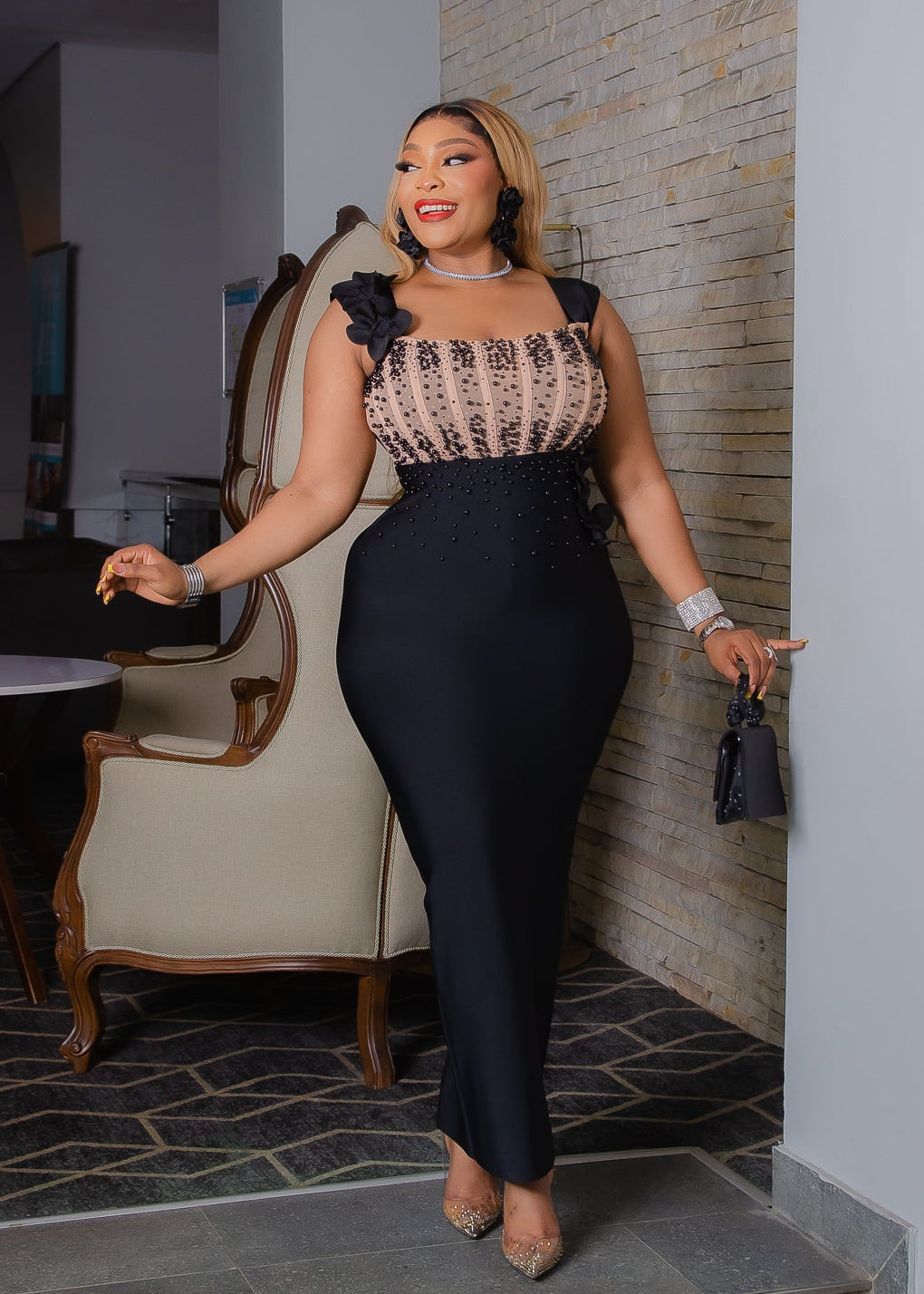 Step into refined elegance with this sleeveless bandage dress , designed to sculpt, flatter, and captivate. The upper bodice features a beige corset-inspired design , richly embellished with 3D floret petals, black beads, and black rhinestones , creating a striking contrast against the sleek black silhouette.