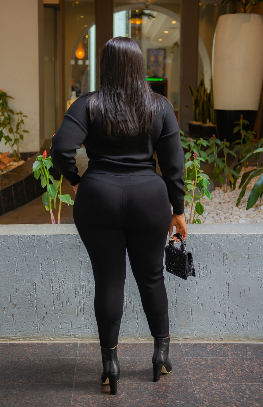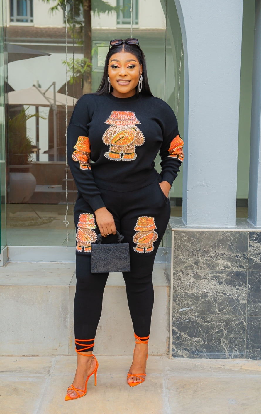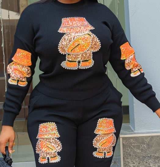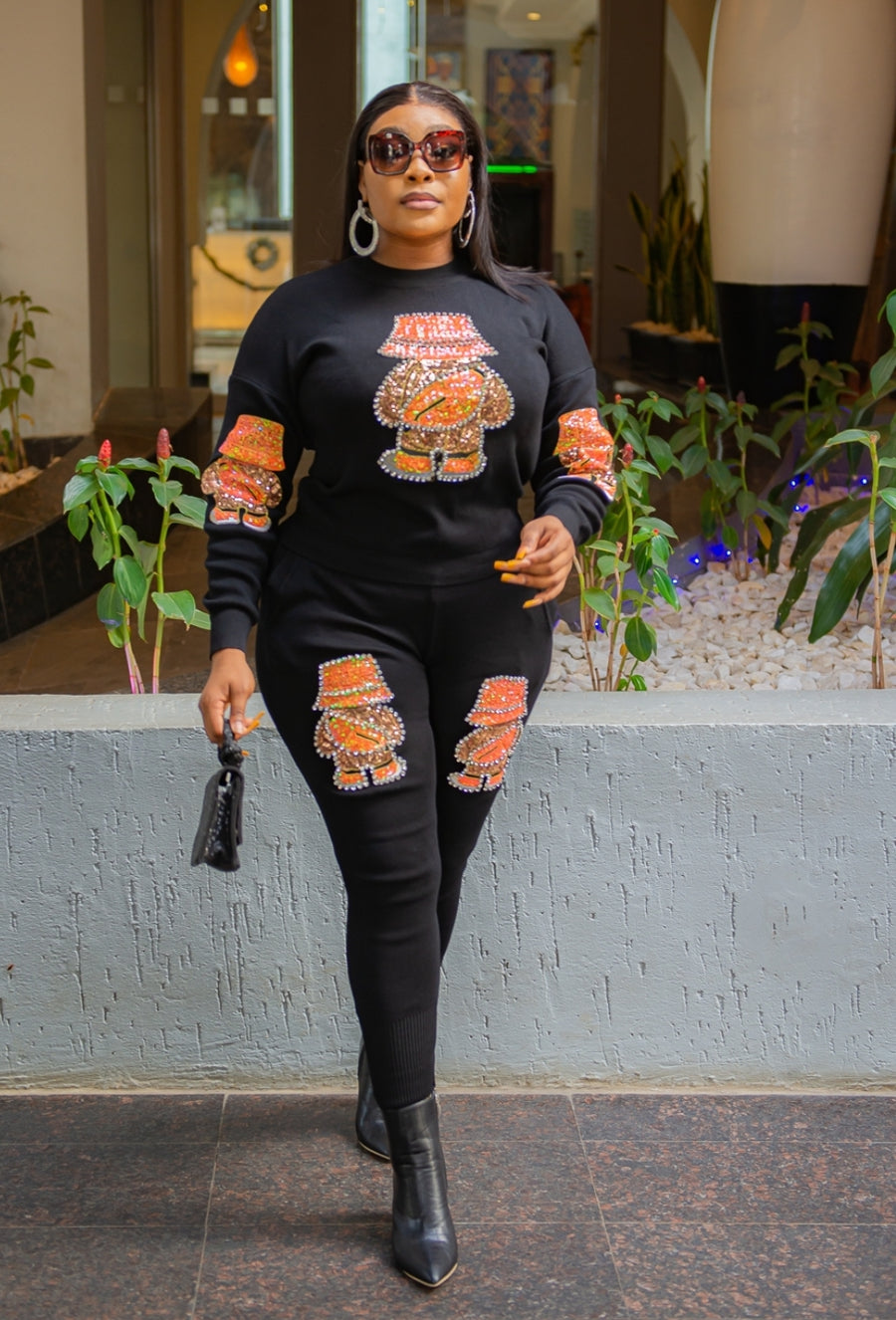 This Embellished Two Piece Sweater Tracksuit is a SHOW STOPPER SET !!! Luxurious figurine design in front of tracksuit top and on pants.