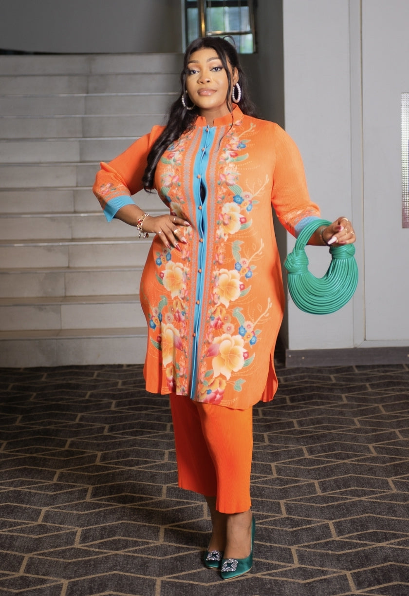 Hit refresh on your weekend wardrobe with this floral beauty! This FLORAL PLISSE set is at the top of our season hit list. Featuring a beautiful wrinkle plisse material; Collar Style Neckline with button closure; split cut-out front/sides design tunic blouse (can be worn as a dress) and a matching capri length pants. Style with closed/open-toe pumps/mules and statement jewelry for a head turner look.