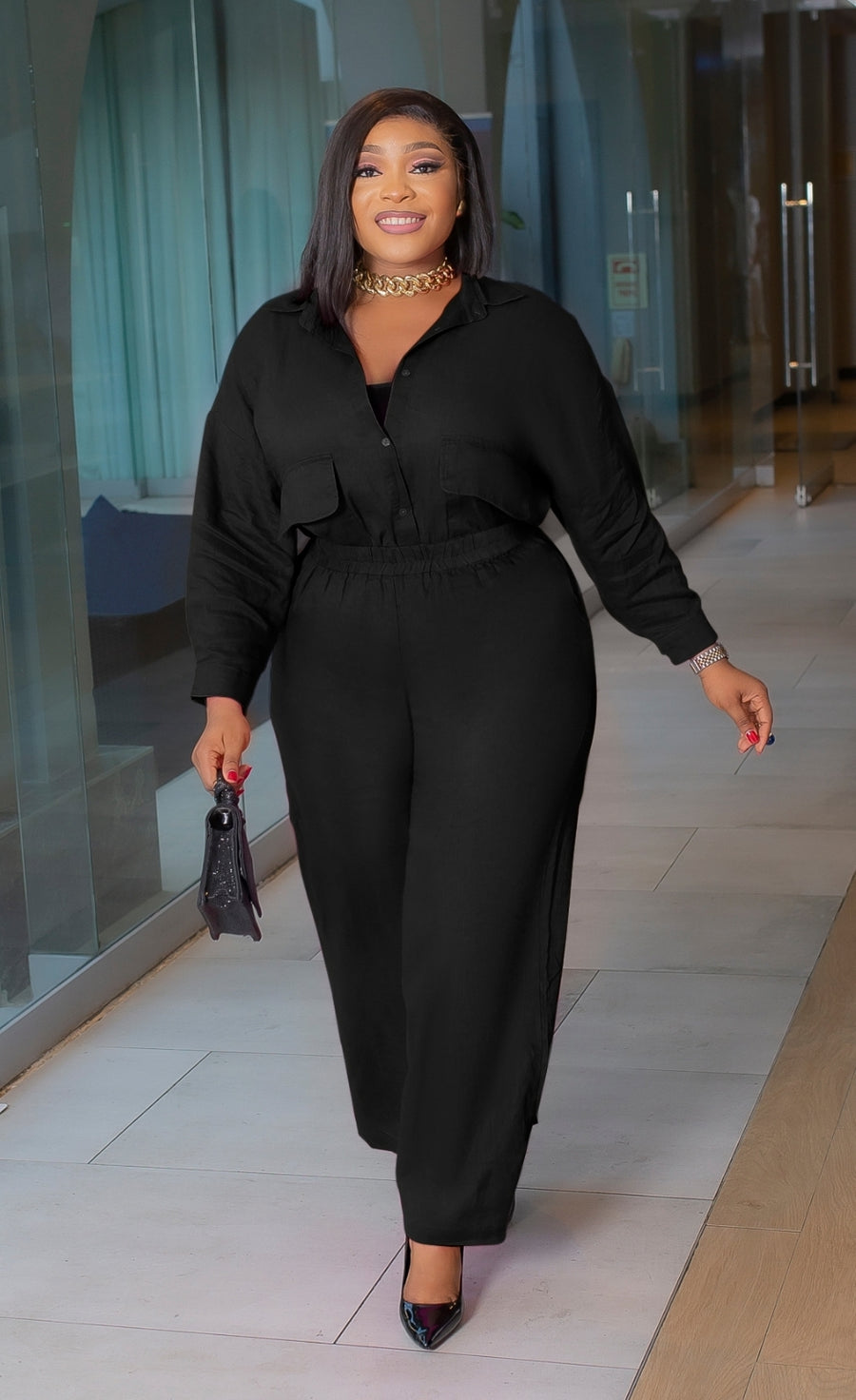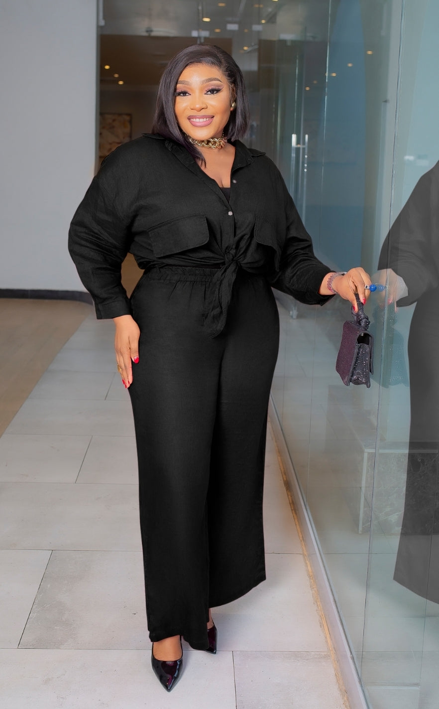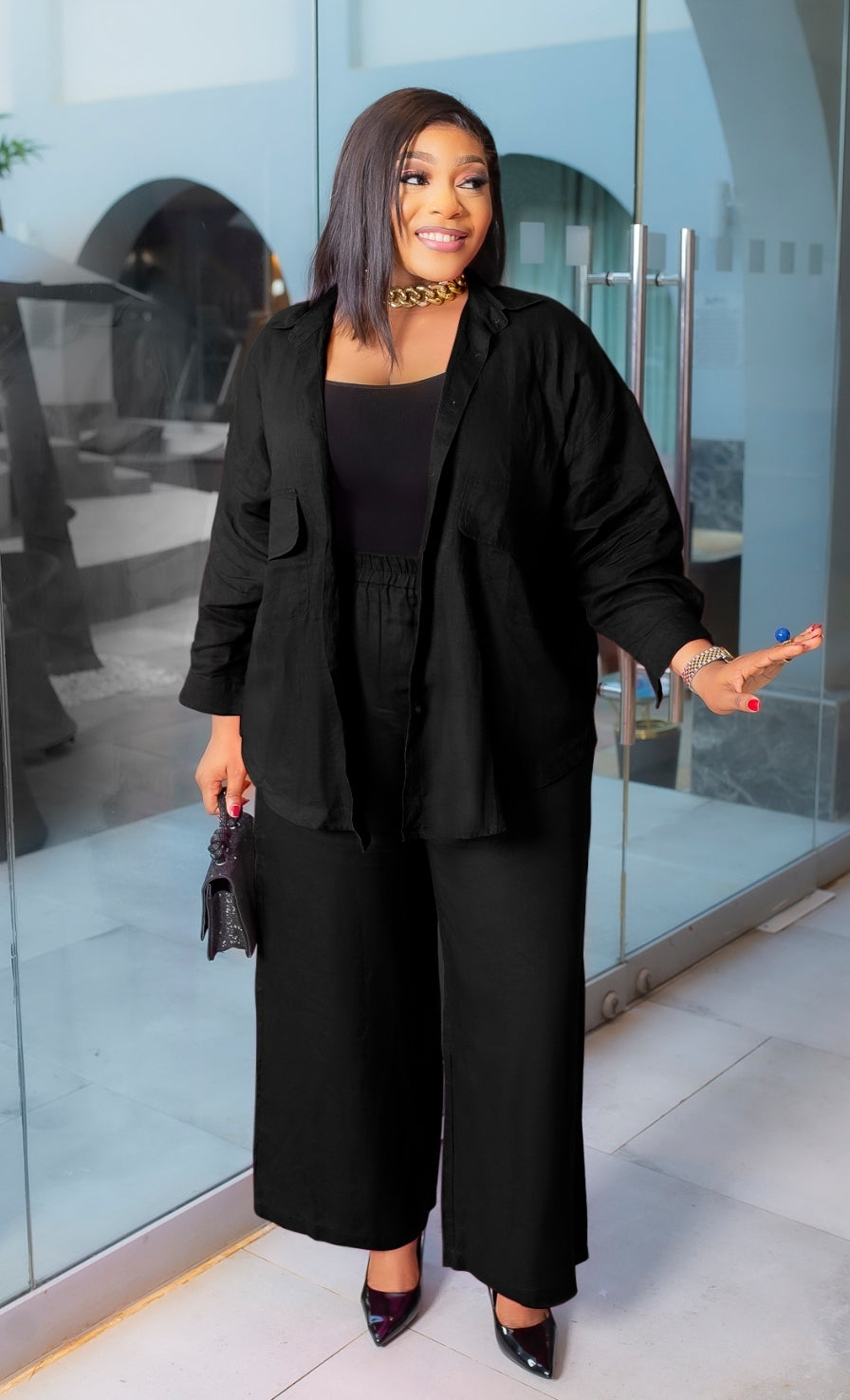This Two-Piece Collar Neckline Blouse and Pants set features a beautiful linen blend fabric design. Flap false chest pockets make this set so TRENDY! Style oversize style blouse tucked in or tucked out. Add a waist belt to take the look up a notch. A great SET addition to your wardrobe. Perfect for all seasons! Pair with open or closed toe heels and statement accessories for a wow look.