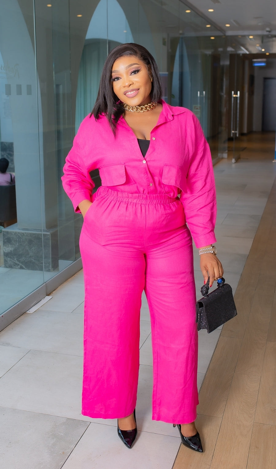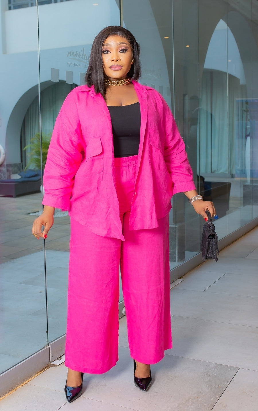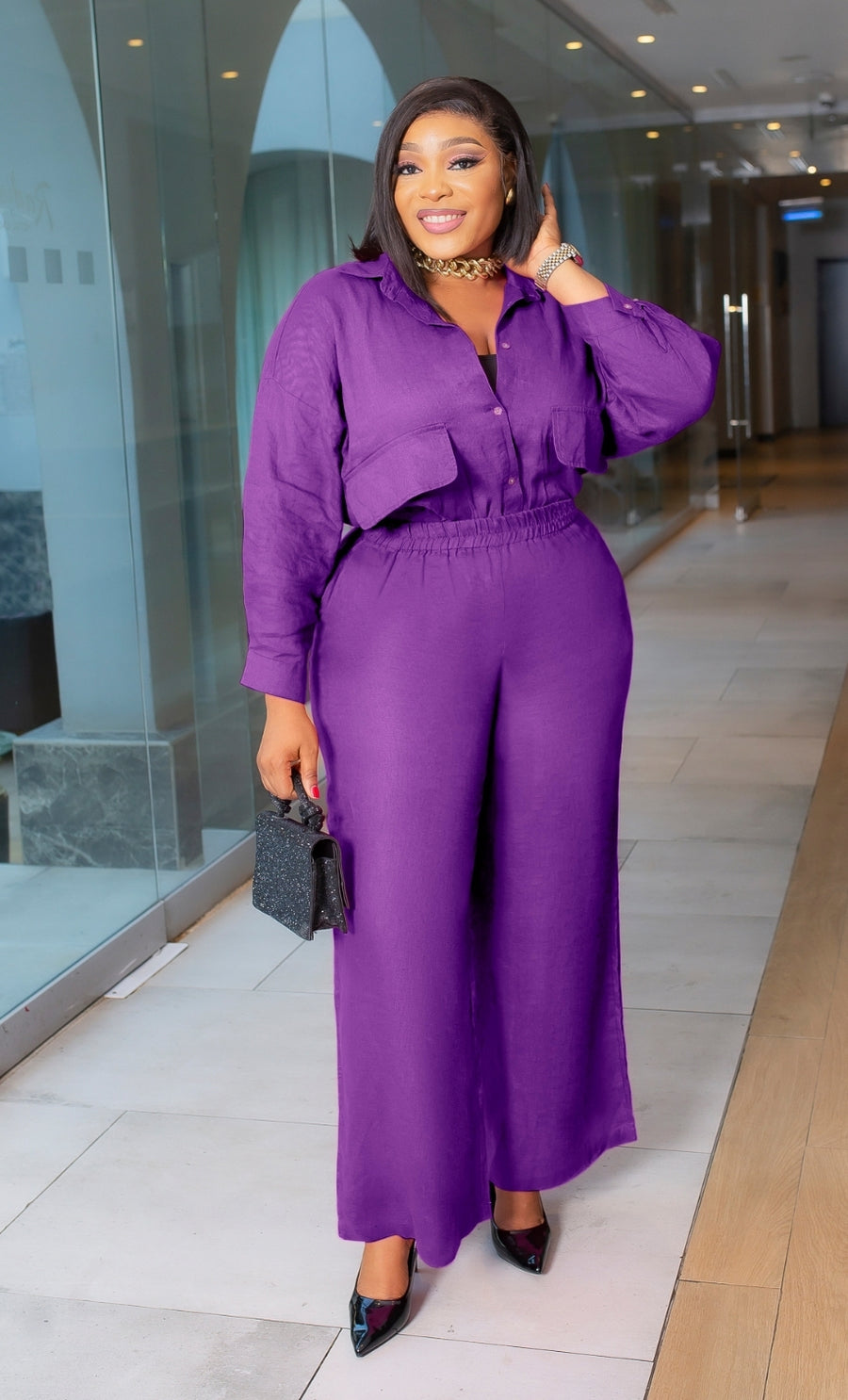 This Two-Piece Collar Neckline Blouse and Pants set features a beautiful linen blend fabric design. Flap false chest pockets make this set so TRENDY! Style oversize style blouse tucked in or tucked out. Add a waist belt to take the look up a notch. A great SET addition to your wardrobe. Perfect for all seasons! Pair with open or closed toe heels and statement accessories for a wow look.
