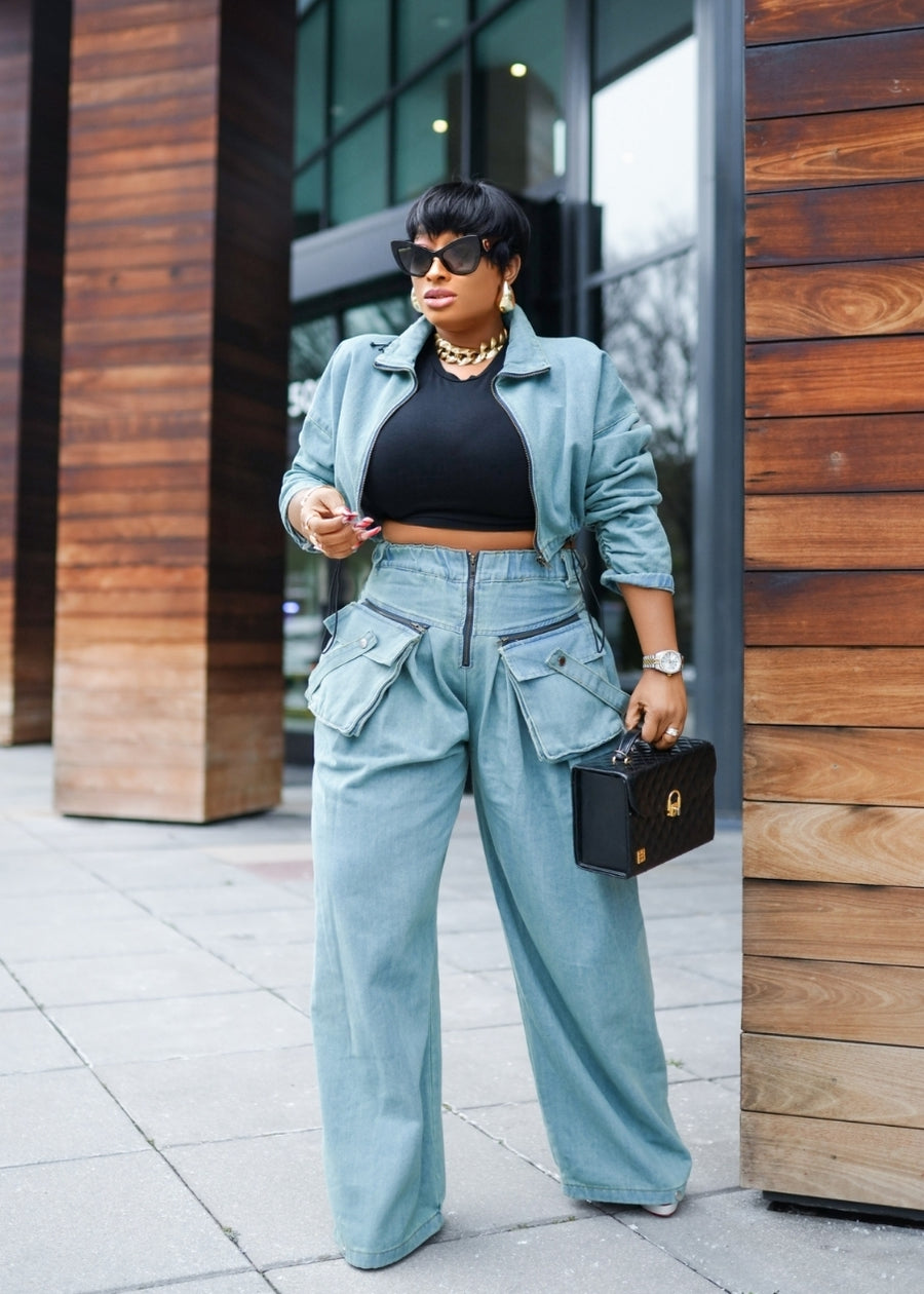 Fashion Forward Diva- 2pcs Denim Crop Blouse/Cargo Pant Set (NEW! 2 colors)