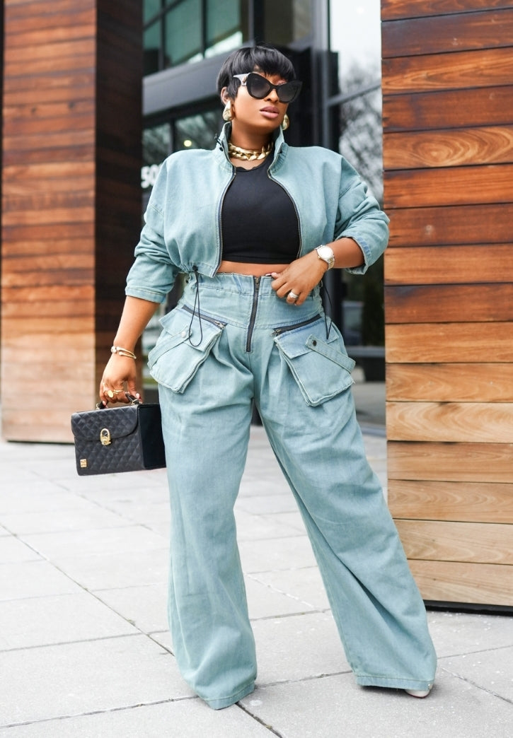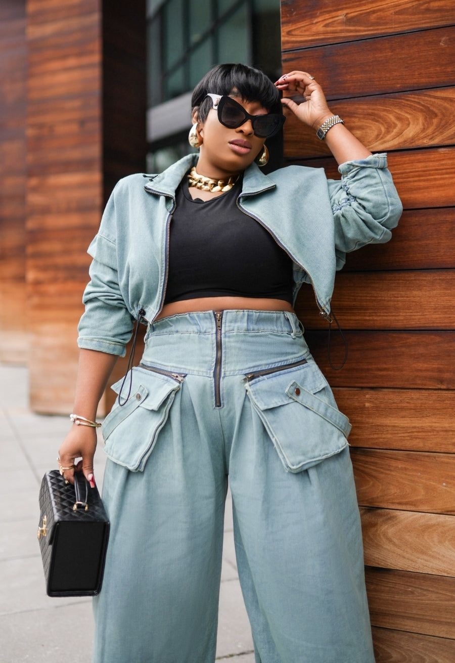 Paired with the crop blouse is our versatile pleated HIGH WAIST cargo trouser, designed for the modern woman on the go. The pleats add a touch of flair to the trousers, elevating your overall look. The detachable pockets set these trousers apart, providing you with the flexibility to switch up your style effortlessly. Whether you prefer a streamlined silhouette or a more utilitarian vibe, the detachable pockets allow you to tailor your outfit to suit any occasion.Versatile for any occasion, this set seamlessly transitions from casual outings to trendy gatherings and from day to night outings, making a bold statement wherever you go. A must-have for those who appreciate both style and comfort. Upgrade your look with our denim pant set!
