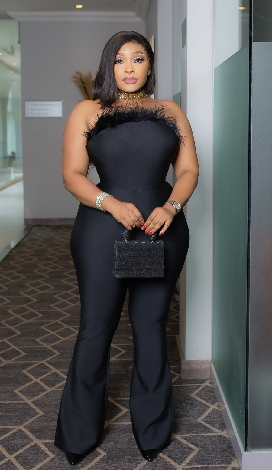 Black is the trending shade of the season, and this JUMPSUIT is a must. Featuring stretchy bandage material, stunning feathers with SLEEVELESS design and a full jumpsuit length. Team this with clear strap heels or closed toe pumps and a chic clutch to complete the look!