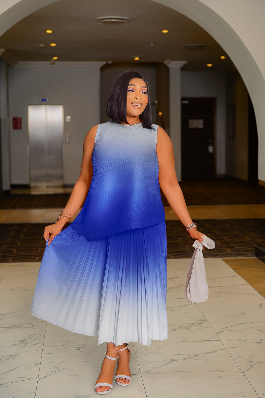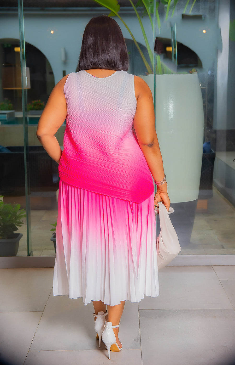 Color Pop! Step into this OMBRE colorblock plisse set, a fusion of contemporary elegance and charming design. Crafted to redefine sophistication, this ensemble features a striking asymmetric sleeveless blouse paired flawlessly with a matching colorblock pleated skirt. This ensemble exudes effortless charm and modern allure.
