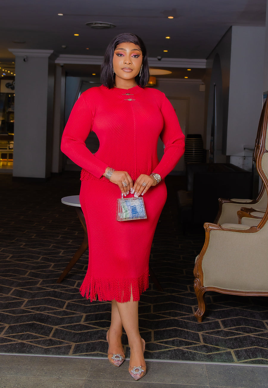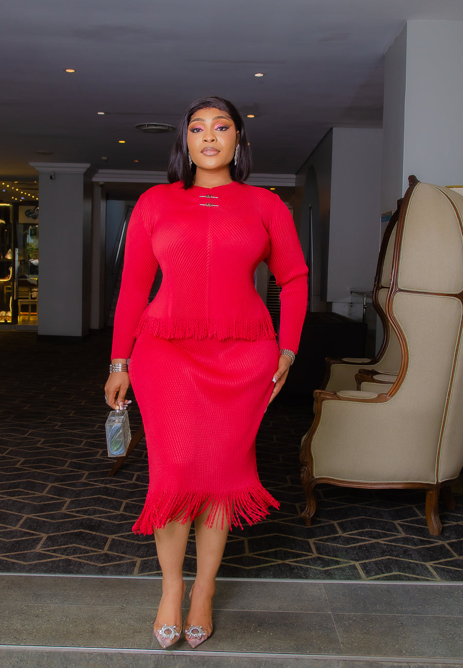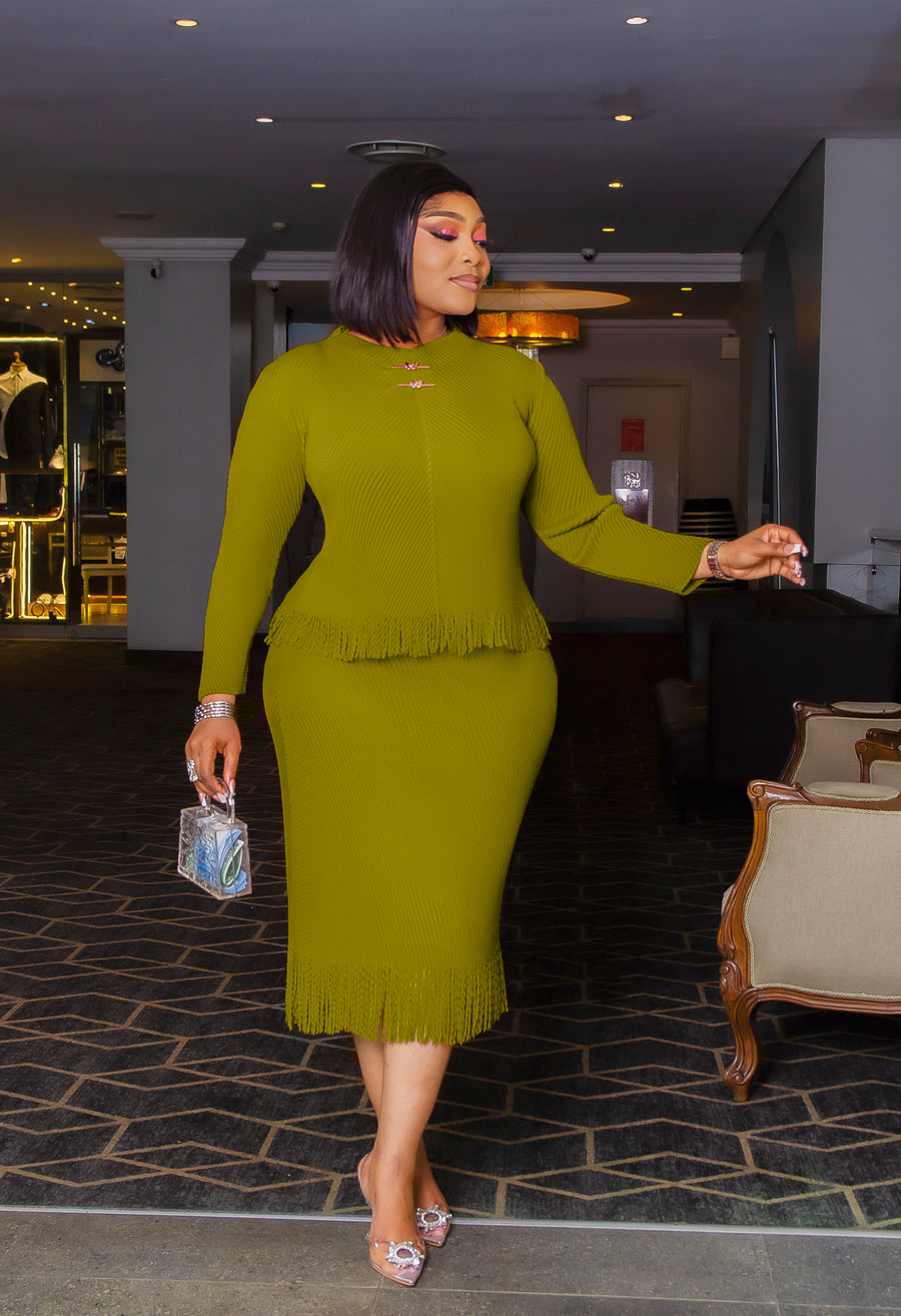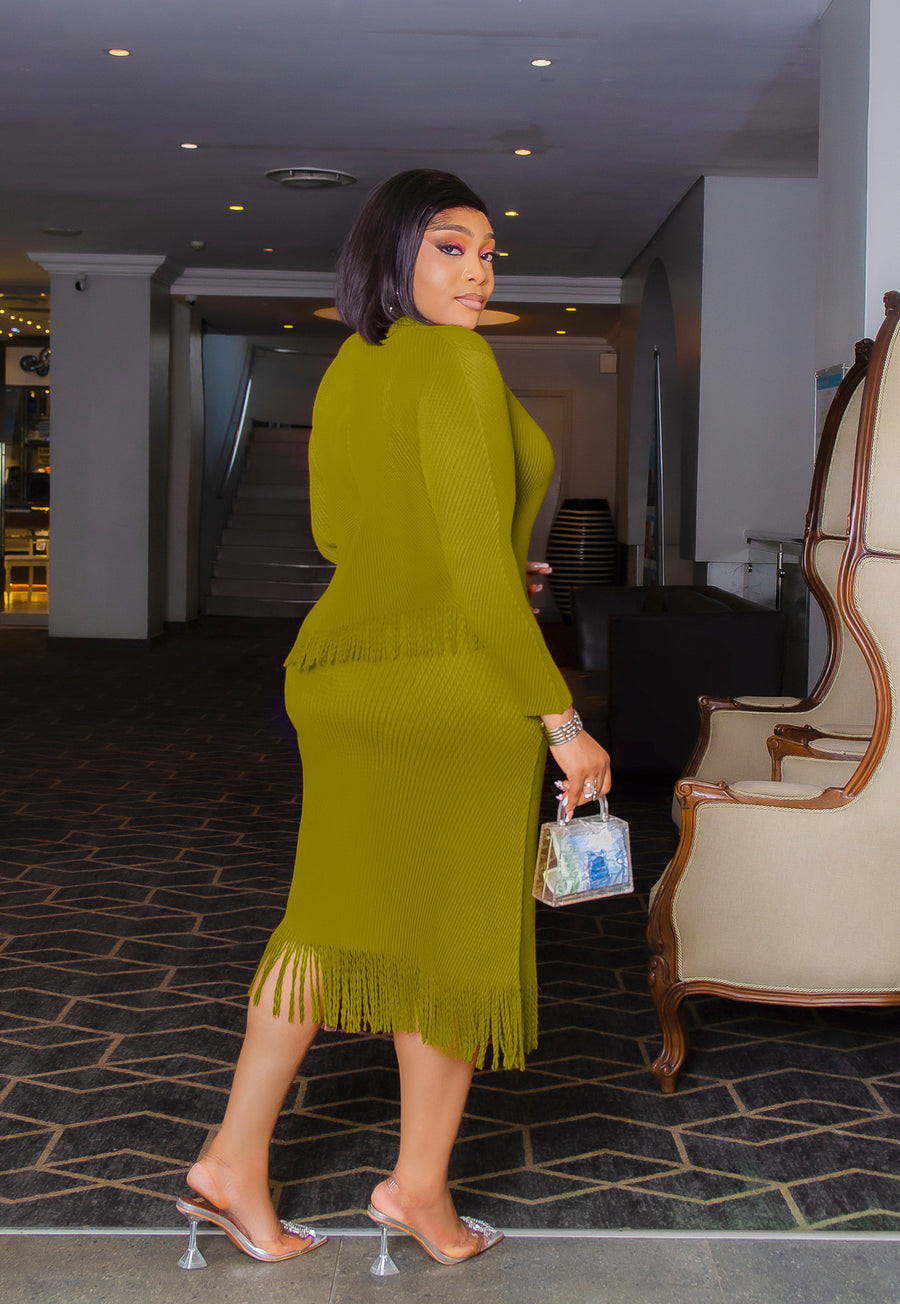The three-quarter sleeve top is finished with a soft tassel fringe hem, while the midi-length skirt completes the look with a beautifully flowing tassel fringe bottom that moves gracefully with every step.