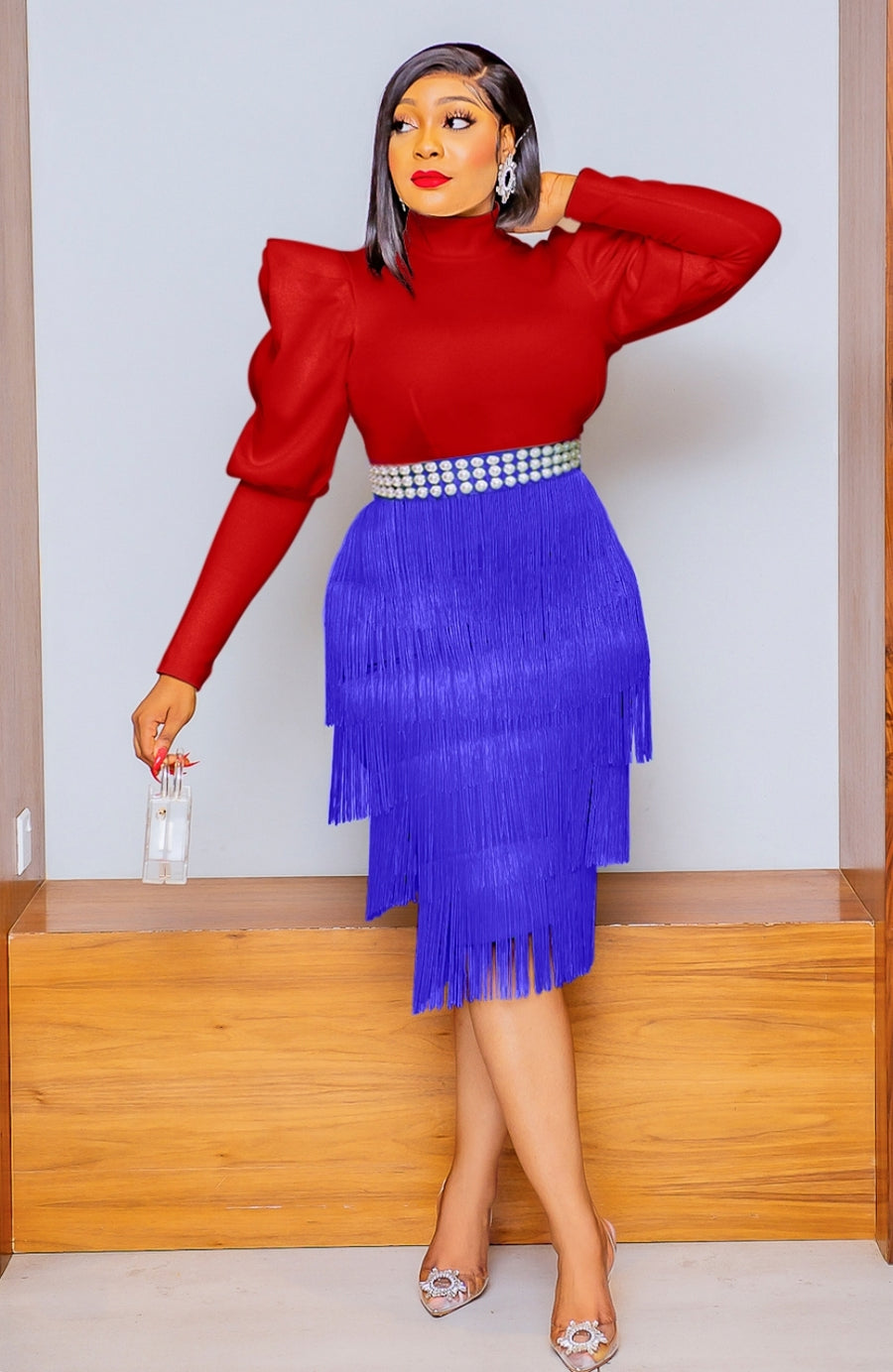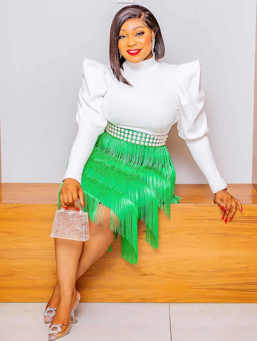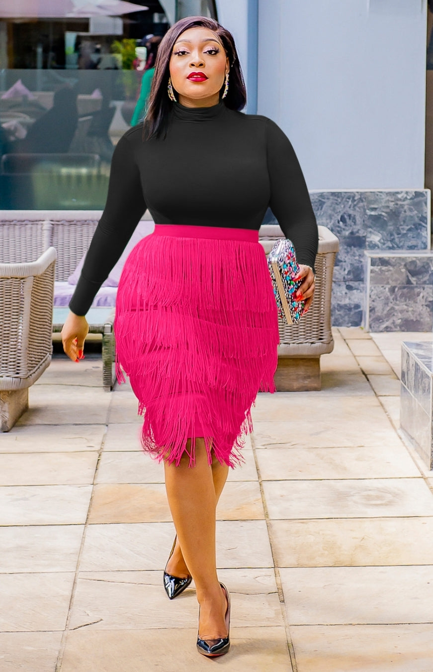 Solid fabrics are totally in right now and this skirt is at the top of our hit list. Featuring a pencil fabric with a tassel fringe design and slight stretch. Style this skirt with multicolored or solid color tops and heels for a look that is perfect for a night cocktail party. HEAD TURNER