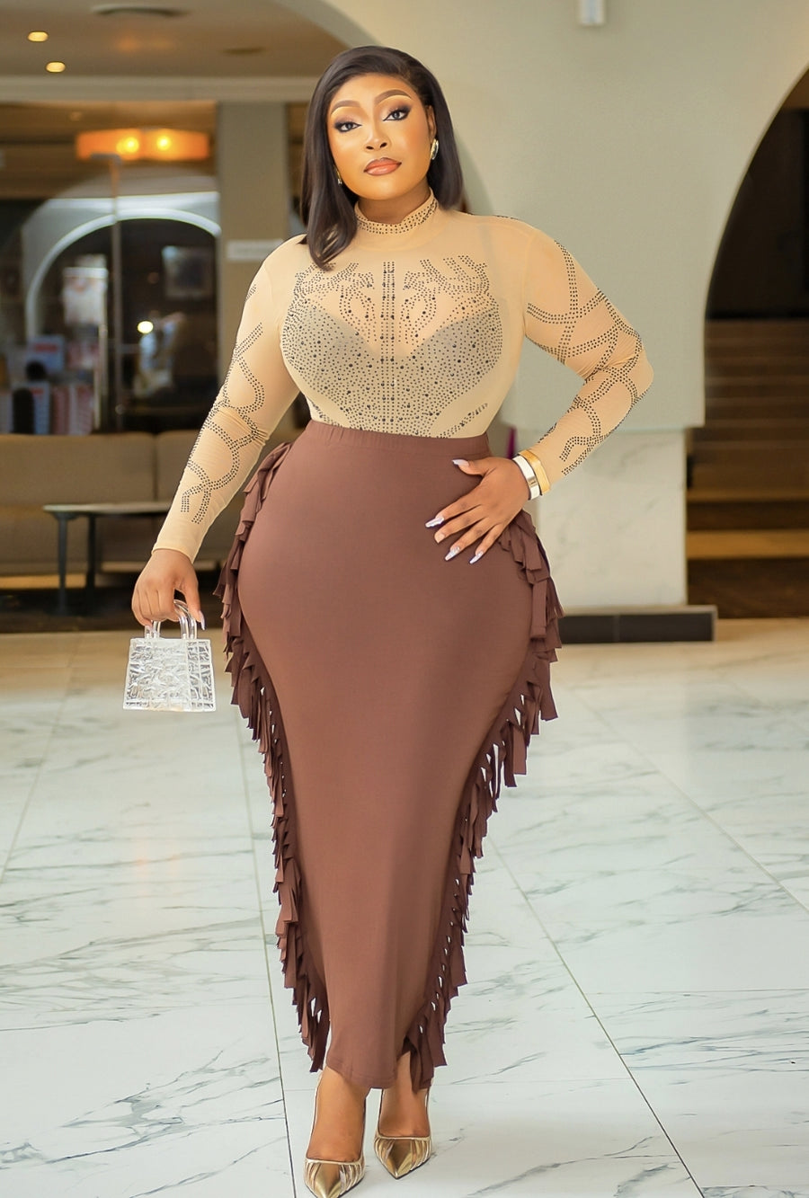 Stunning side cut fringes Galore DetailsElegant party pencil skirtPair with Solid Colors or Multi-colorsSTATEMENT TASSEL FRINGE BODYCON SKIRTFabric has stretchNo zipper (Pull on design)Fabric- Cotton/Polyester/SpandexLength- 41 inches2 COLORS- Brown and BlackMODEL IS 5'6" WEARING SIZE LARGE (Waist 35 inches; Hip 48 inches)________________________________________________