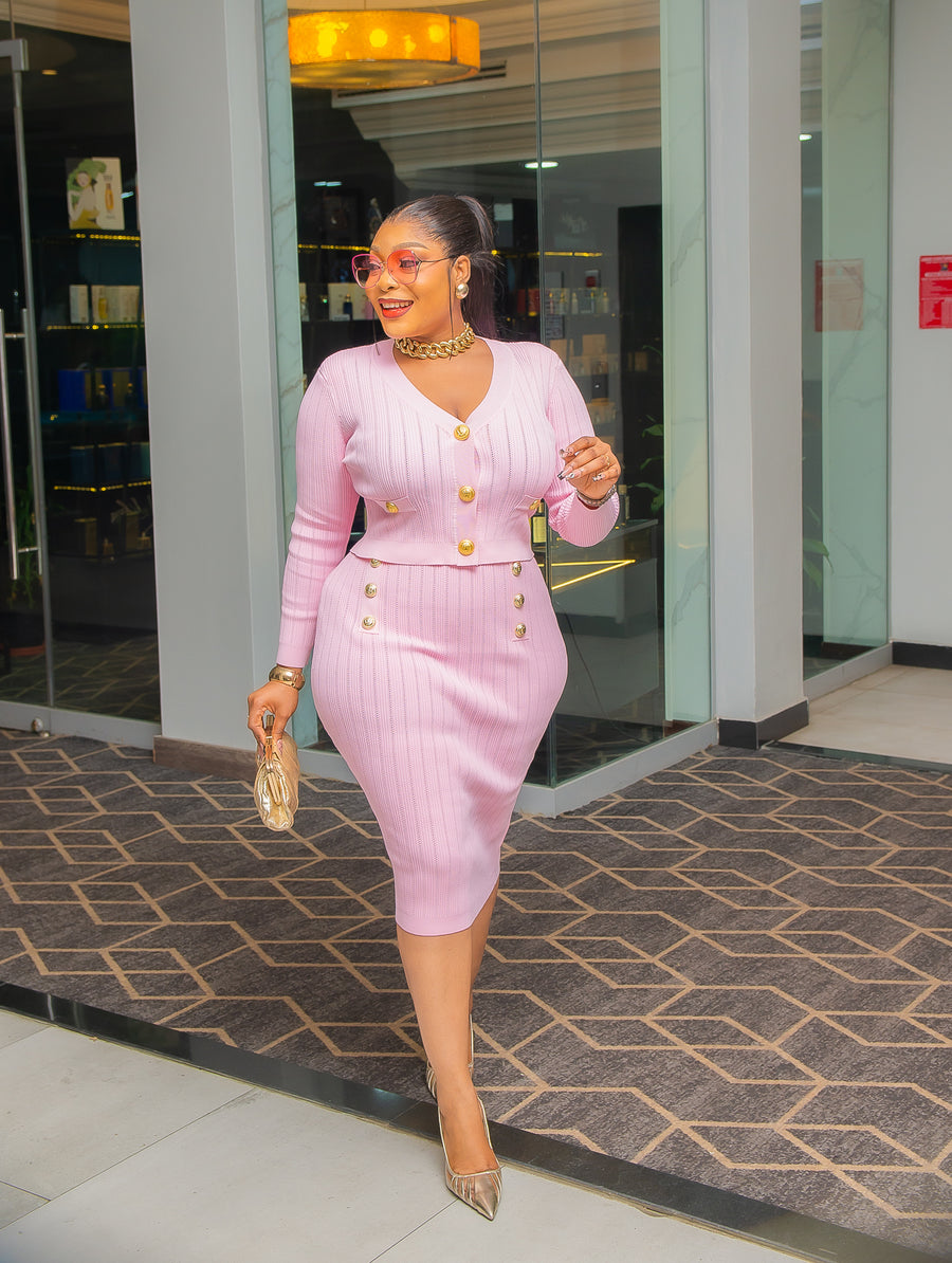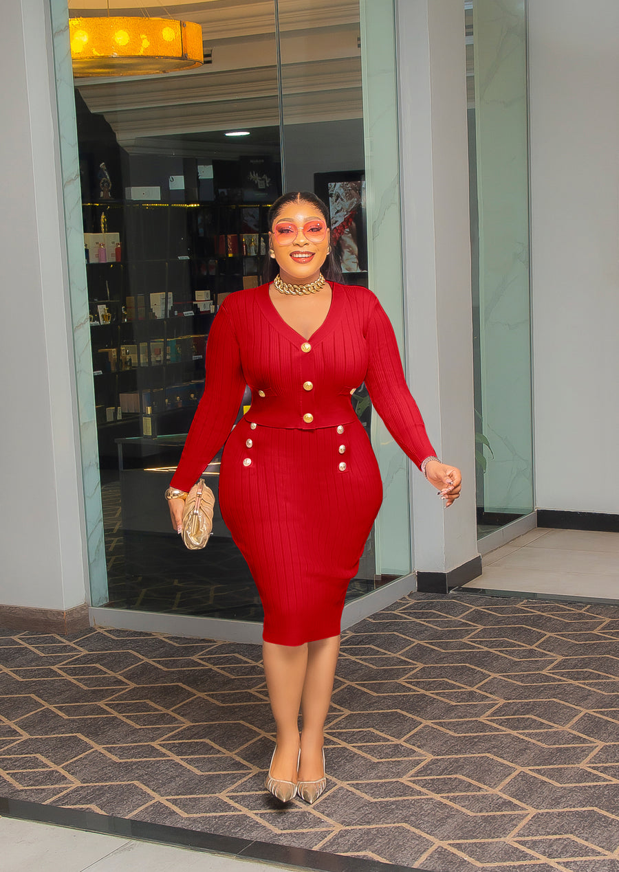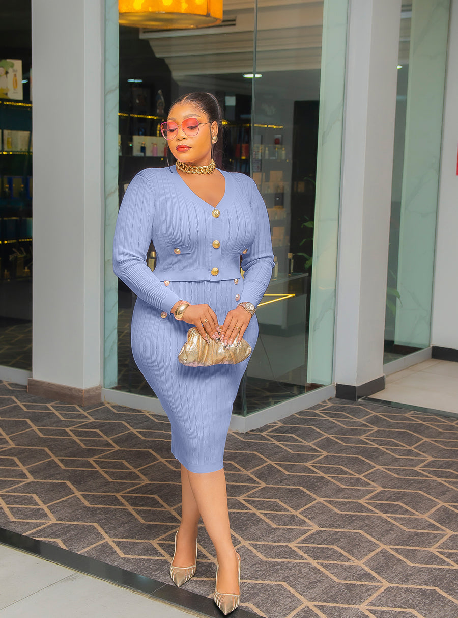 Embrace timeless sophistication with this sweater skirt set, a chic ensemble that combines elegance and comfort. The set features a cropped power shoulder long-sleeve blouse adorned with striking gold buttons, adding a hint of luxury to the cozy knit texture. Paired with a midi-length skirt, the skirt showcases an intricate arrangement of gold buttons down the front, making this set a perfect choice for style-savvy individuals. Ideal for both casual outings and polished events, this set exudes a polished, modern appeal that ensures you stand out effortlessly.