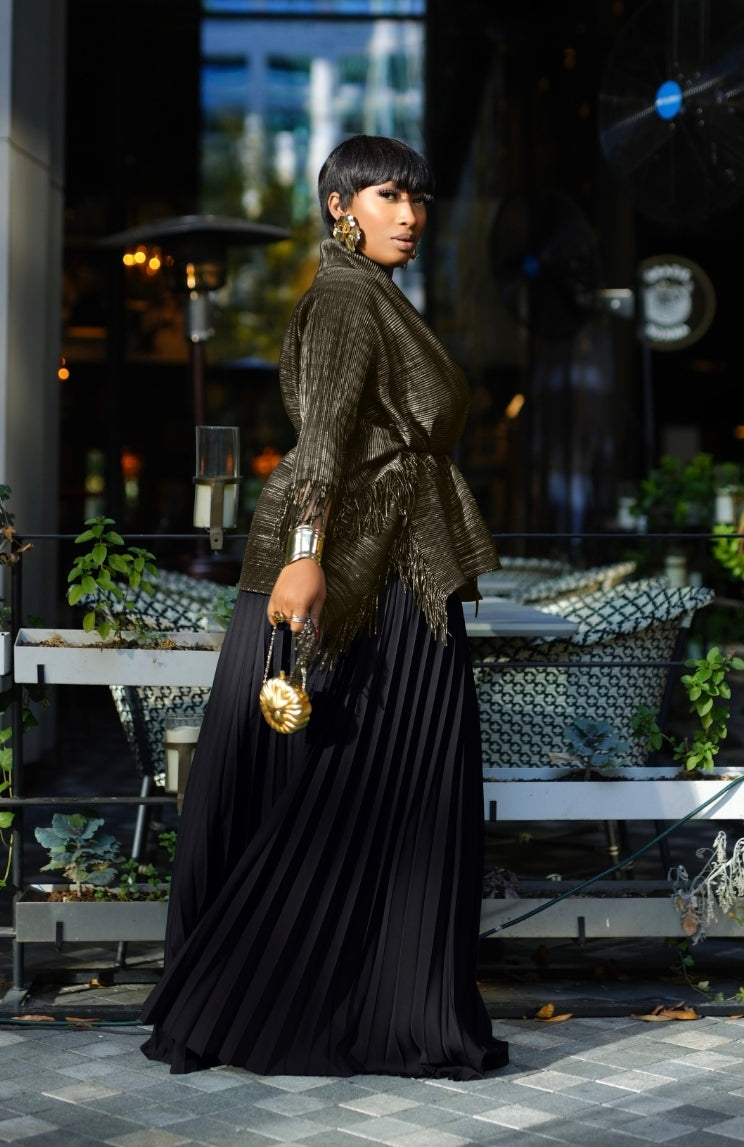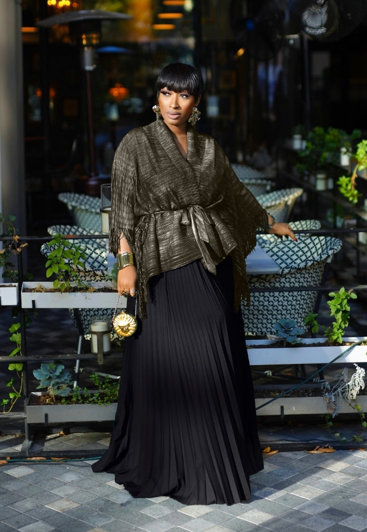 Color Pop! Step into this gold shimmering threads colorblock plisse set, a fusion of contemporary elegance and avant-garde design. Crafted to redefine sophistication, this ensemble features a striking SOLID COLOR with GOLD twirls plisse overlay cape blouse with belt, asymmetric draping and tassel ends, creating a captivating silhouette. Paired flawlessly with a matching SOLID COLOR pleated skirt, this ensemble exudes effortless charm and modern allure.