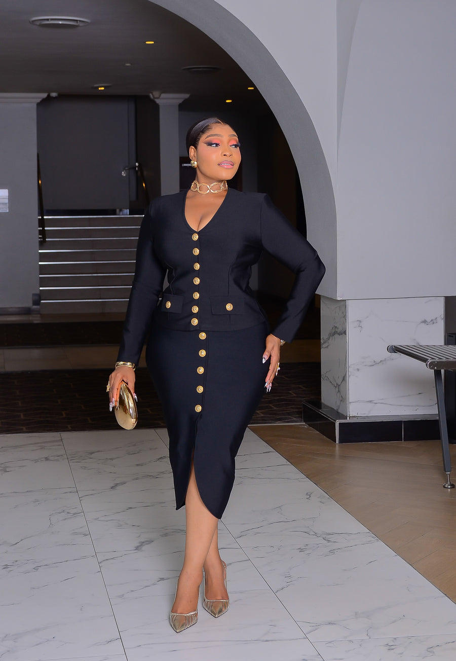 This Luxury Bandage, Gold round buttons Embellished, Peplum-like Blazer/Blouse and Midi SKIRT SET is a HEAD TURNER!! Instantly adds sophistication and class to your style. Definitely a showstopper/head turner this SEASON AND BEYOND! GUARANTEED!