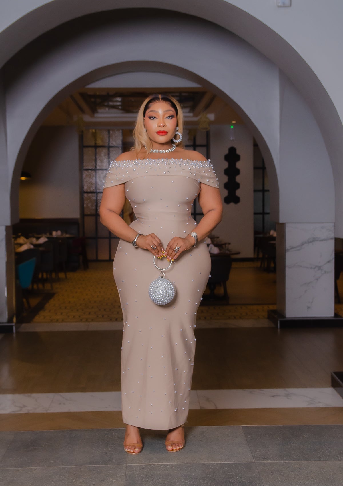 Keep accessories minimal to let the pearls and neckline shimmer.