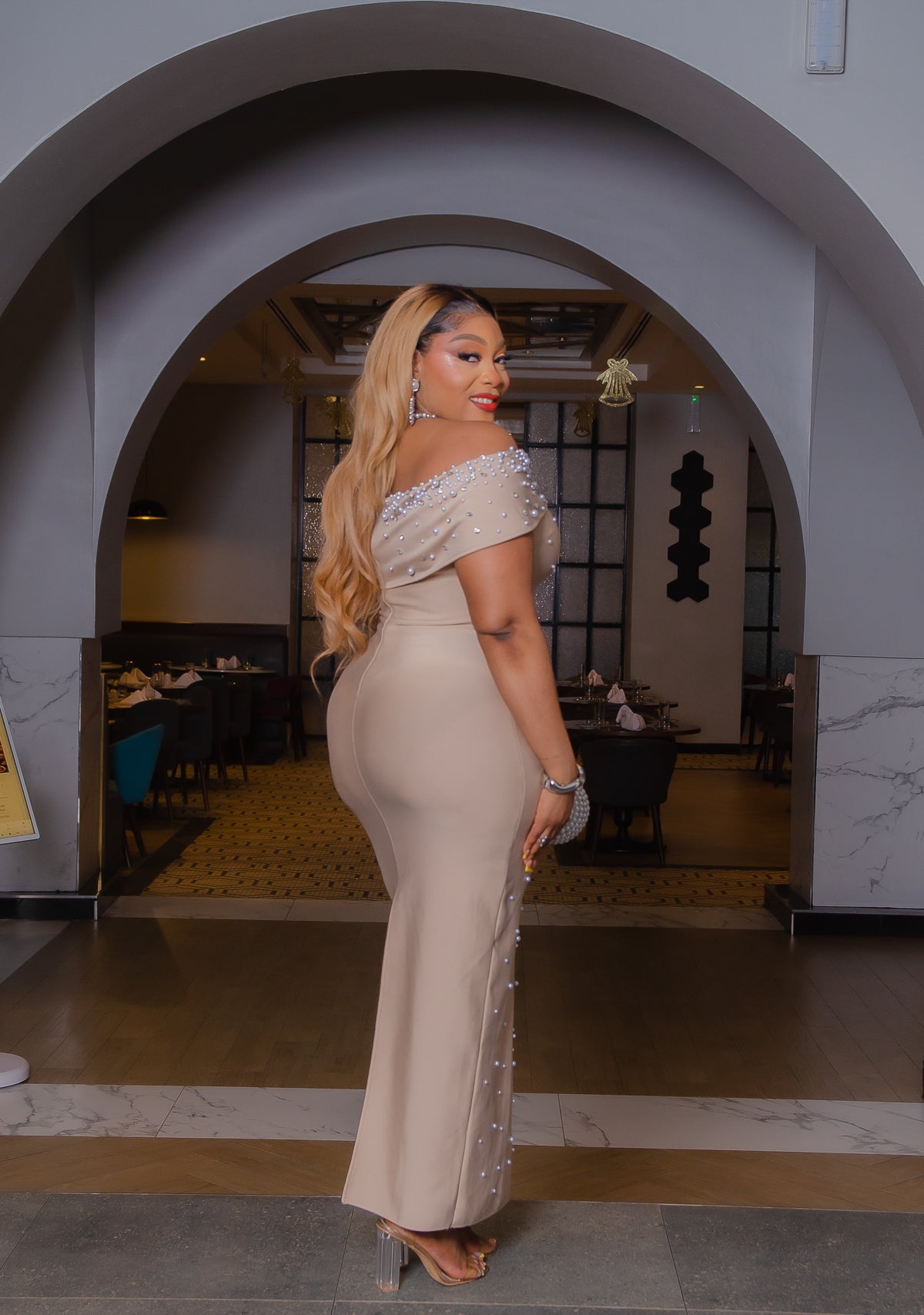 Crafted in premium bandage fabric, this gown contours the body beautifully, enhancing curves while delivering structure and support. The soft champagne-beige tone makes it the perfect neutral statement for weddings, upscale dinners, engagement celebrations, formal events, or elegant evenings out. Champagne Pearl Elegance is understated luxury at its finest.