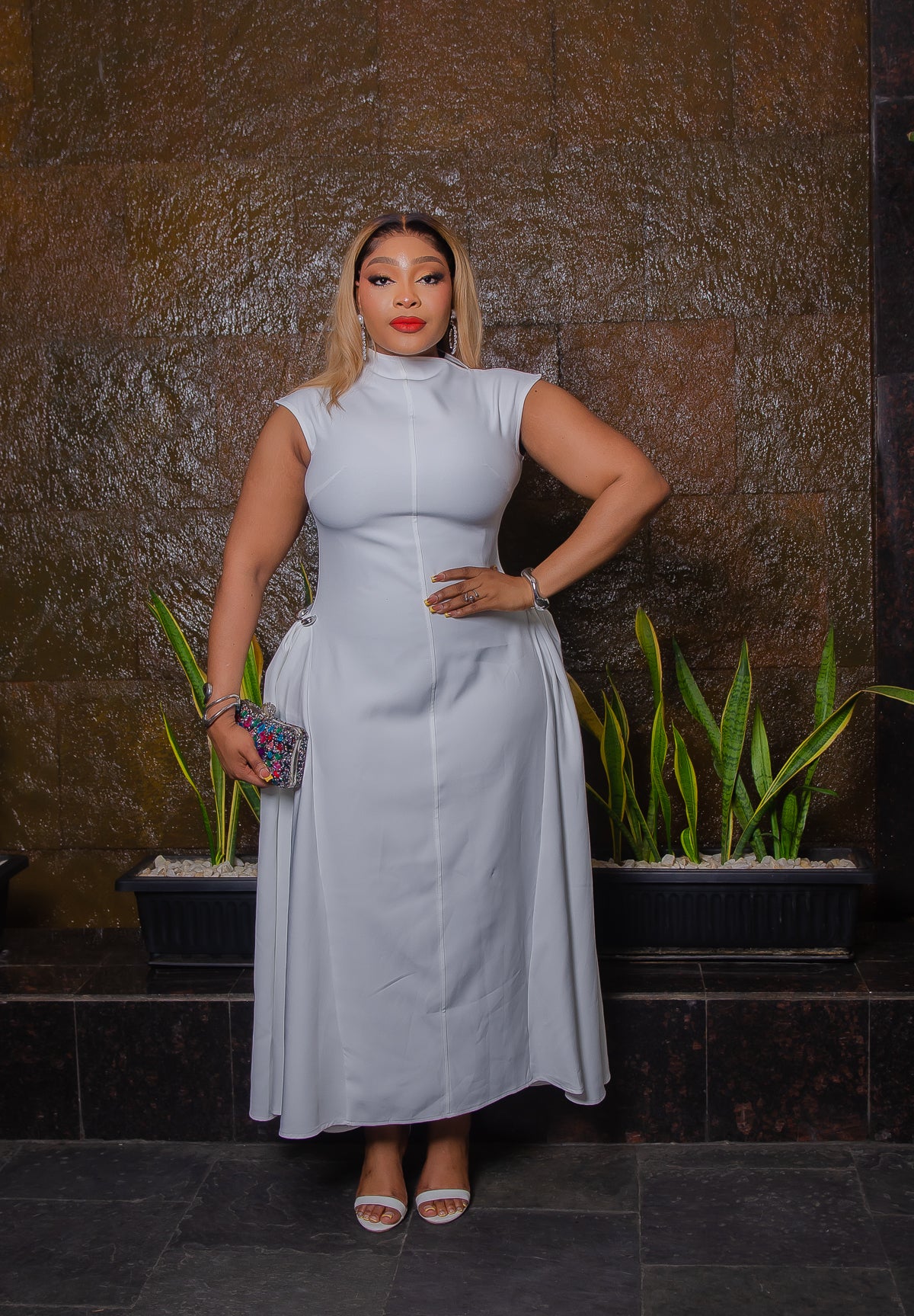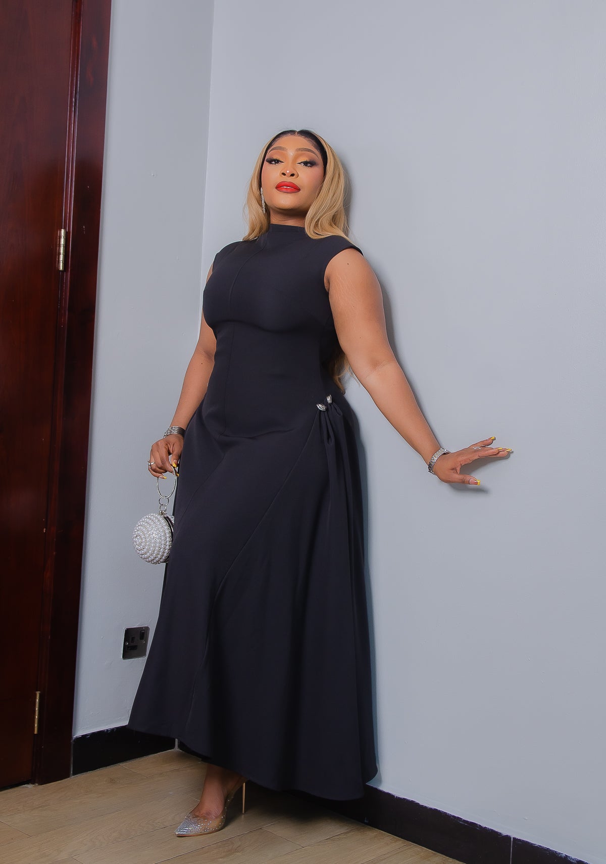 Make an unforgettable statement in this sleeveless A-line fit and flare long length dress , crafted to accentuate your figure with sophisticated flair. The asymmetric hemline adds a modern twist, while the delicately ruched hips sculpt your silhouette to perfection. Elevating the design are dual statement brooch pins on each side of the hip—offering a touch of glam that sets this piece apart.