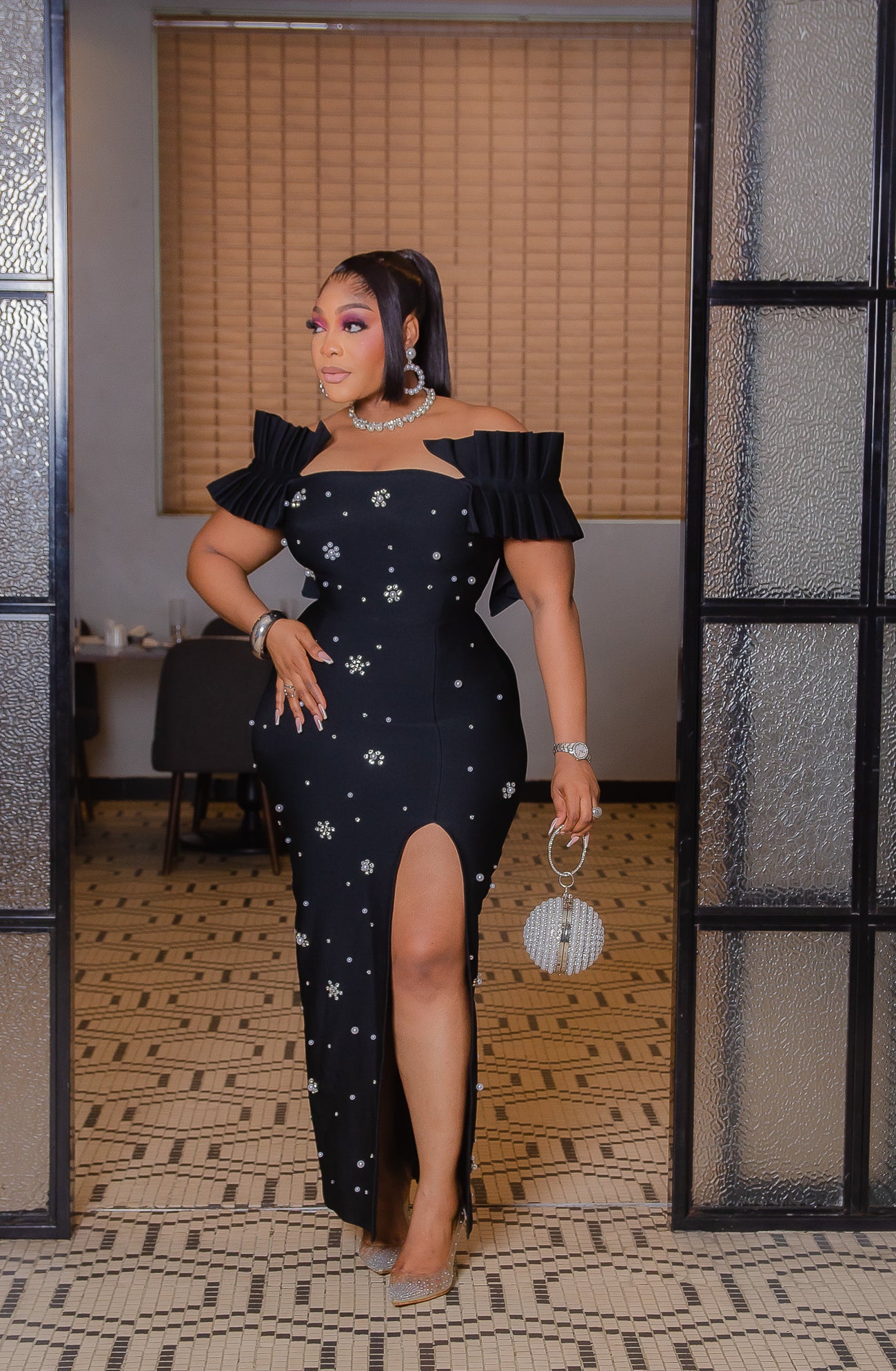 Step into elegance and command the room in our Midnight Pearl Majesty Bandage Gown — a true statement of confidence and sophistication.