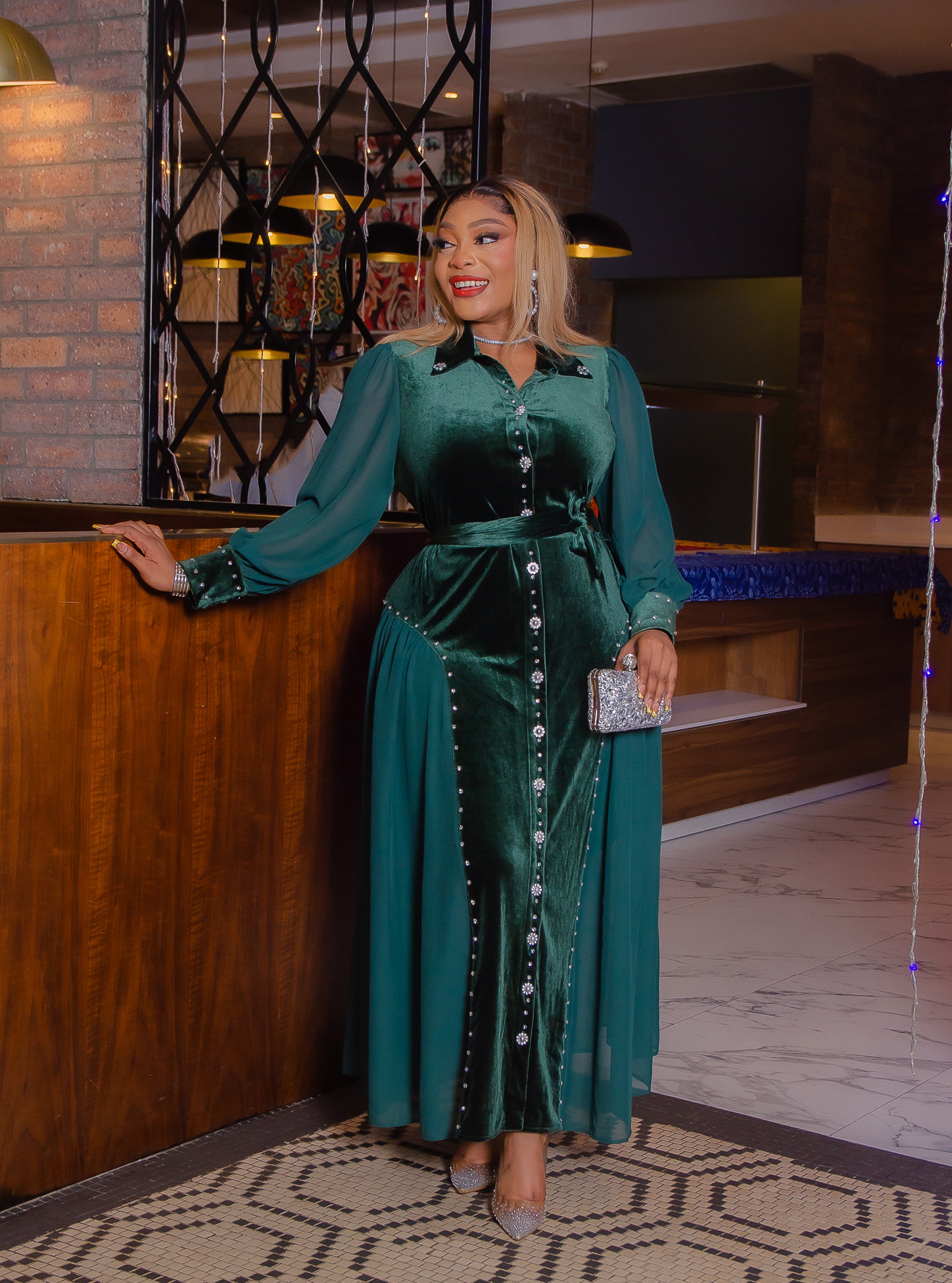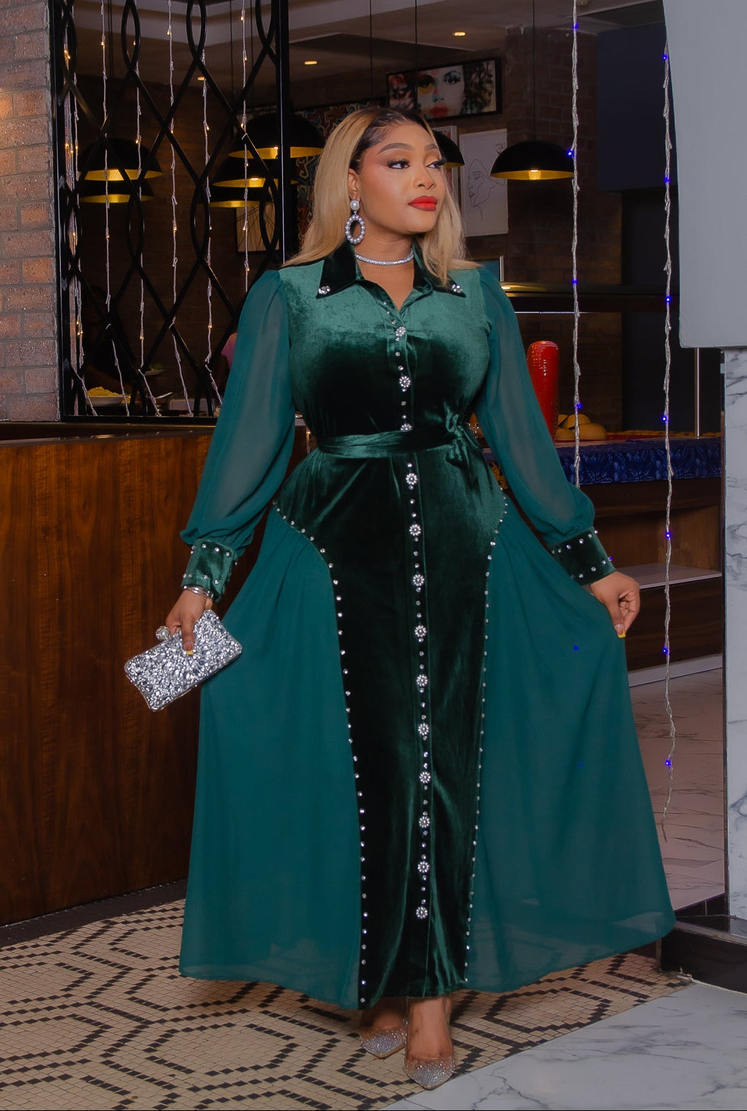 Complete with a matching velvet waist belt and a thin adjustable underslip, the Regal Pearl Grace Gown offers both comfort and refined structure. Available in Green, Wine, and Black, this stunning dress is perfect for holiday parties, Christmas gatherings, New Year services, formal celebrations, and elegant evenings.